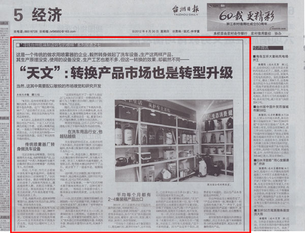 天文公司發明制造洗車器產品的成功轉型,被臺州日報樹為低端制造業轉型的榜樣,原文如下: